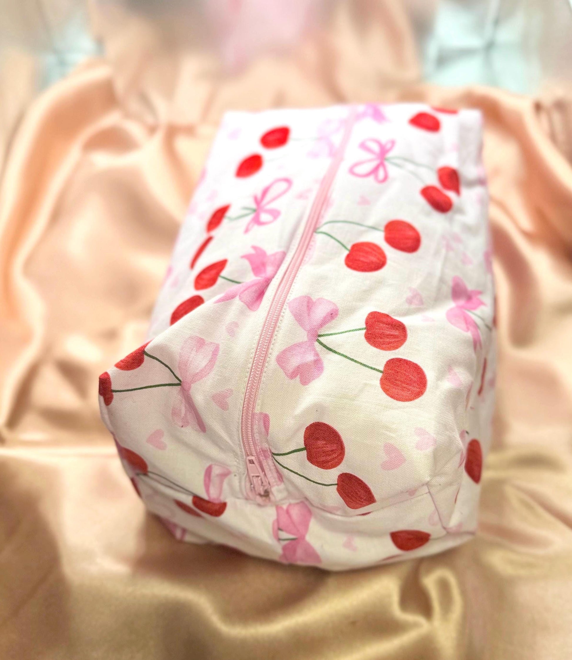 Add a pop of playful charm to your essentials with this handmade pouch, crafted from vibrant cherry print fabric. Perfect for storing makeup, accessories, or everyday must-haves, it's both stylish and practical for on-the-go organization.