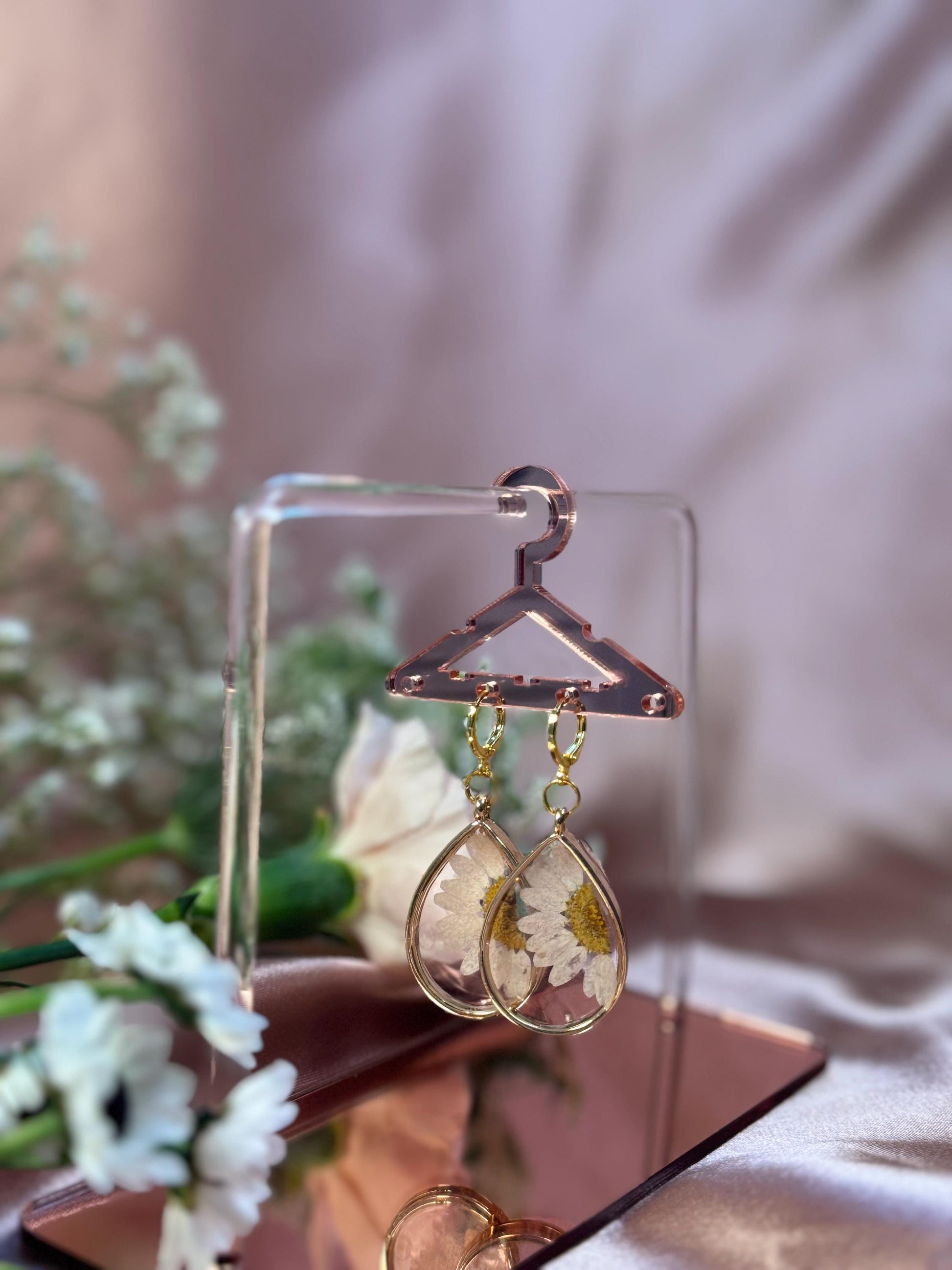 Soft and sweet, these handmade daisy teardrop earrings showcase real dried flowers in a clear resin setting. Lightweight and hypoallergenic—perfect for sensitive ears and sunny personalities.