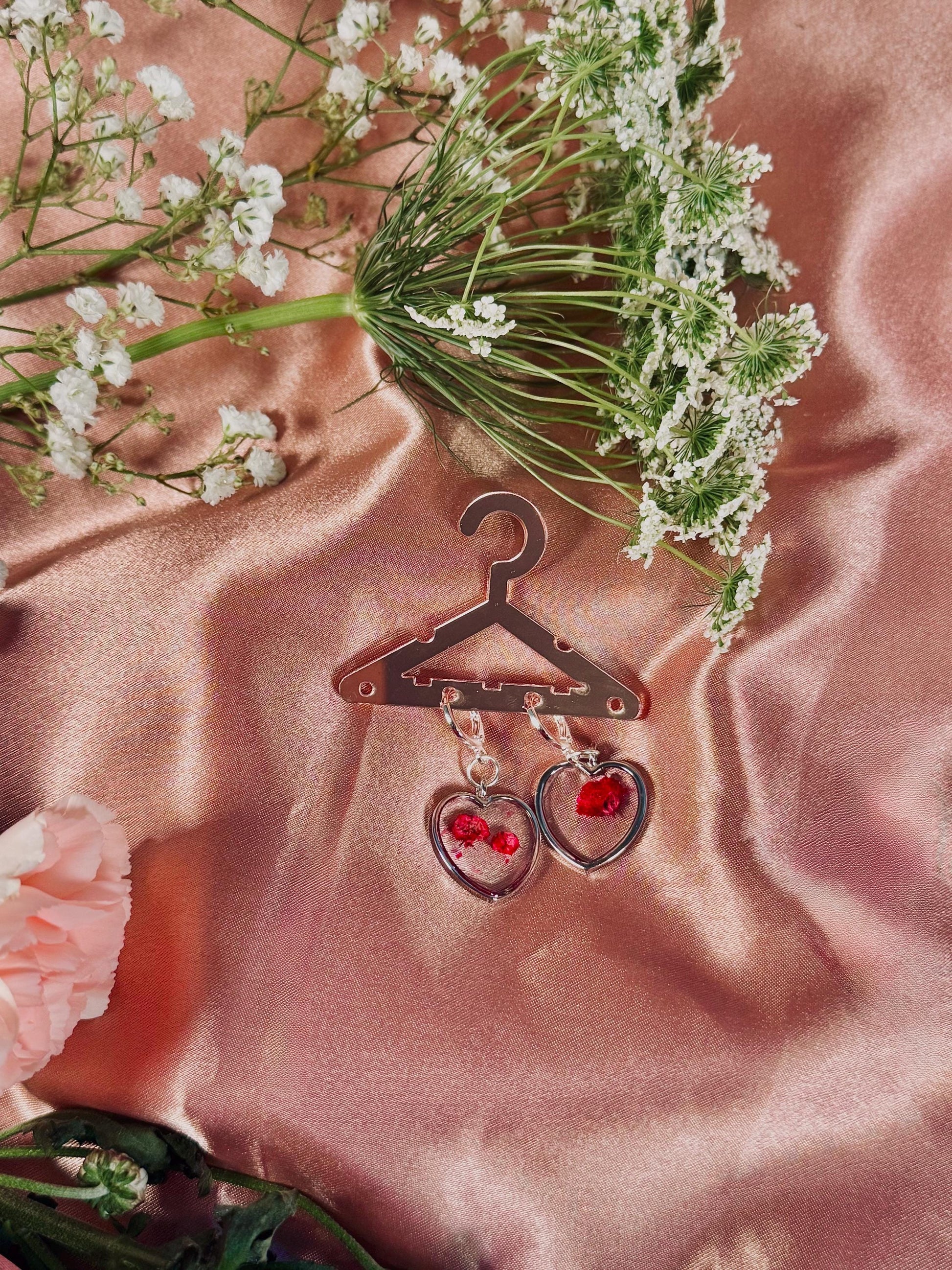 Heart Rose Petal Earrings – Real Dried Flowers in Resin – Silver Heart Dangle – Hypoallergenic – Handmade One of a Kind