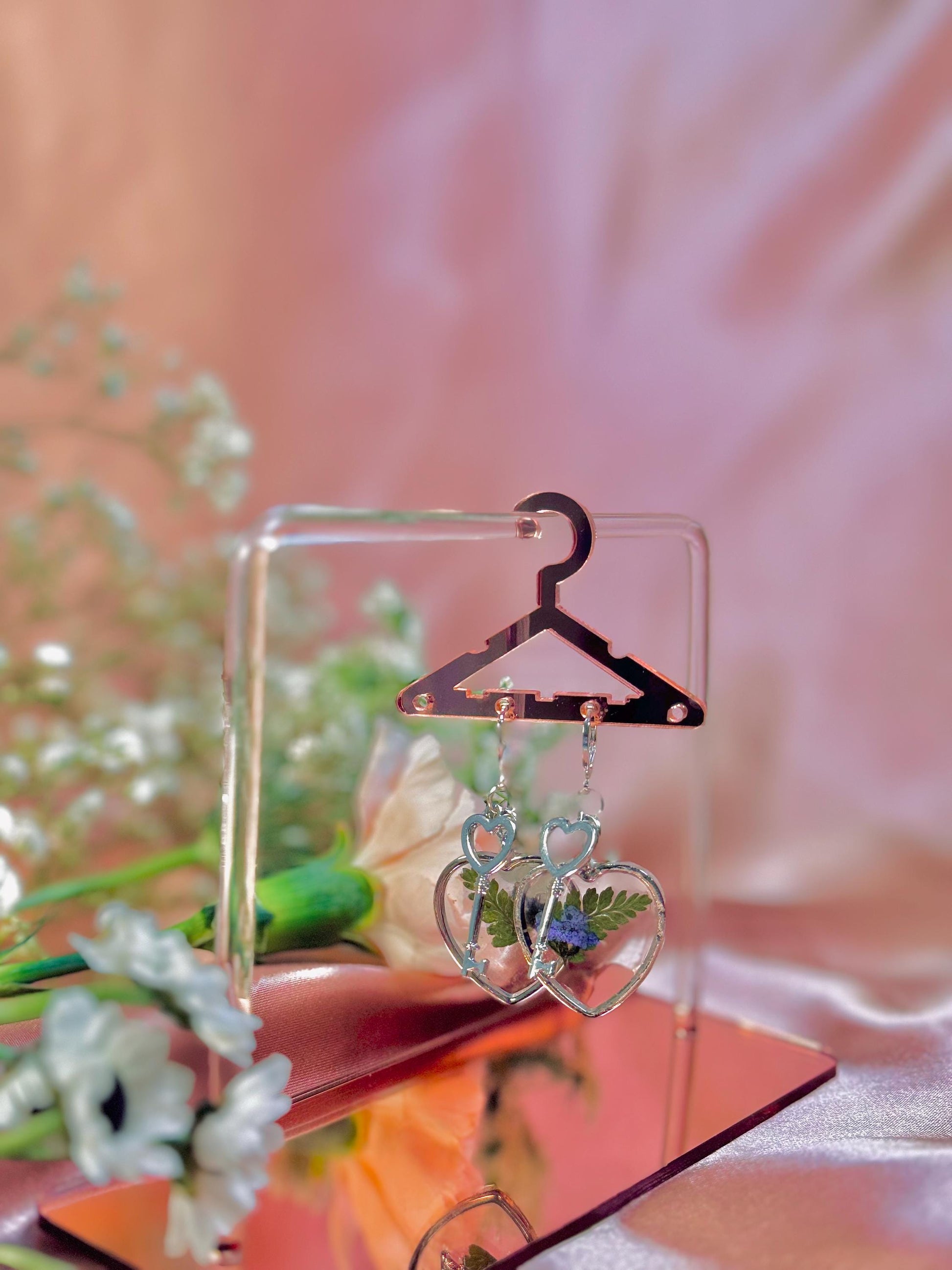 Unlock a little magic with these enchanting heart key earrings, showcasing handpicked florals set in resin within a silver heart frame. Feminine, whimsical, and entirely one of a kind.